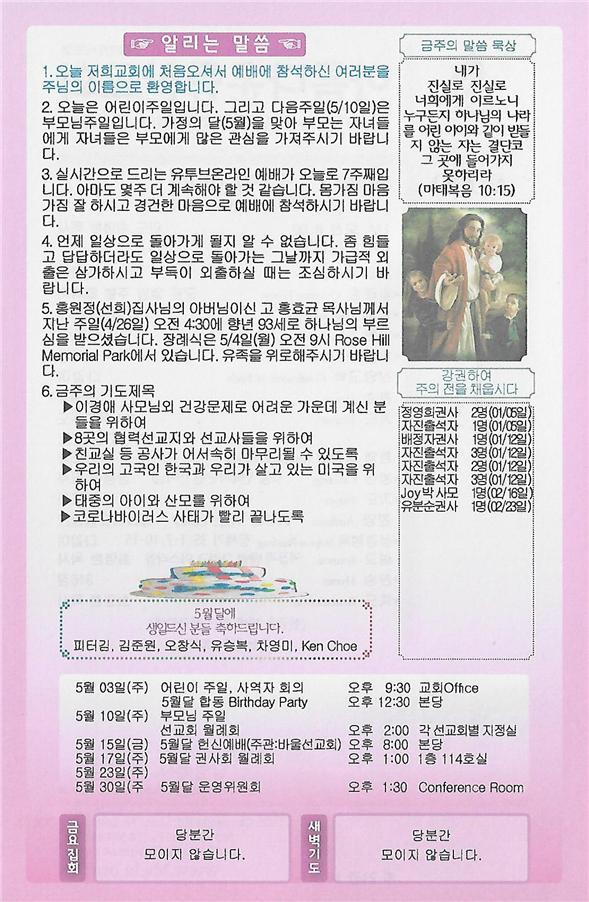05/03/20 주일 교회 소식 페이지 정보 작성자 댓글 0건 조회 2,860회 작성일 20-04-30 21:37 목록 본문 이전글05/10/20 주일 교회 소식 20.05.07 다음글04/26/20 주일 교회 소식 20.04.23 댓글 0 댓글목록 등록된 댓글이 없습니다. 목록