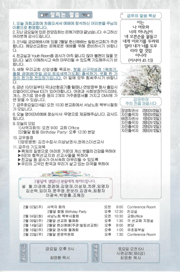 02/02/20 주일 교회소식 페이지 정보 작성자 댓글 0건 조회 2,197회 작성일 20-02-01 11:58 목록 본문 이전글02/09/20 주일 교회 소식 20.02.08 다음글01/26/20 주일교회 소식 20.01.25 댓글 0 댓글목록 등록된 댓글이 없습니다. 목록
