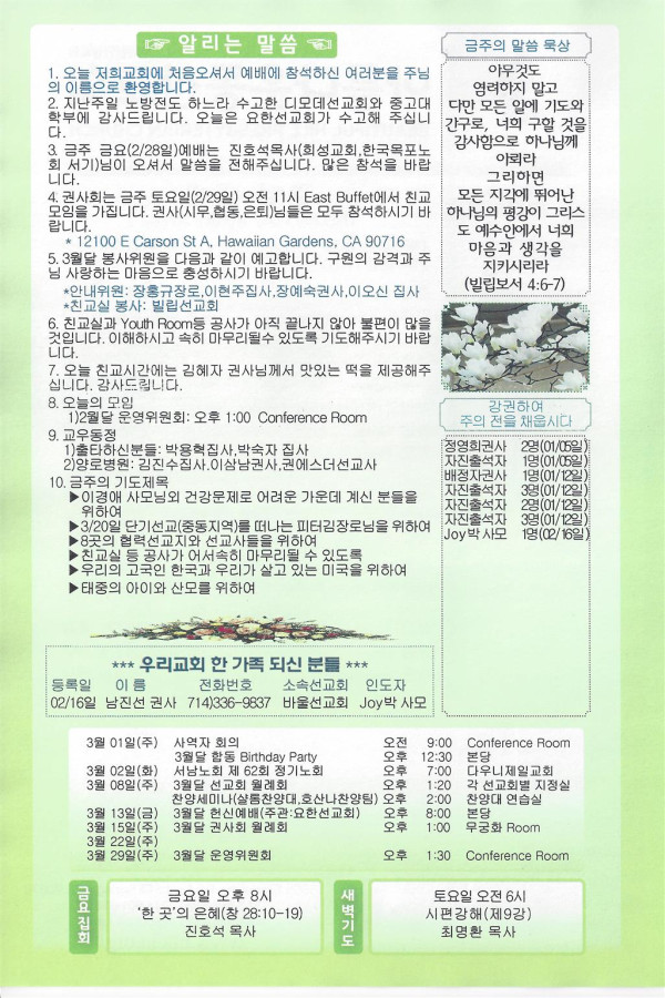 02/23/20 주일 교회소식 페이지 정보 작성자 댓글 0건 조회 2,416회 작성일 20-02-22 09:16 목록 본문 이전글03/01/20 주일 교회 소식 20.02.29 다음글02/16/20 주일 교회 소식 20.02.15 댓글 0 댓글목록 등록된 댓글이 없습니다. 목록