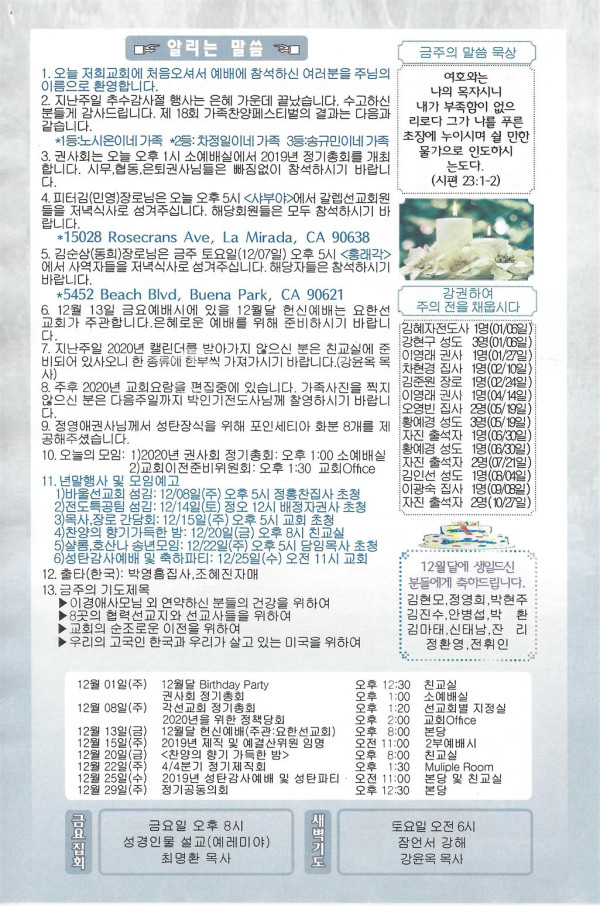 12/01/19 주일 교회 소식 페이지 정보 작성자 댓글 0건 조회 2,941회 작성일 19-11-30 12:00 목록 본문 이전글12/08/19 주일 교회 소식 19.12.07 다음글11/24/19 주일 교회 소식 19.11.23 댓글 0 댓글목록 등록된 댓글이 없습니다. 목록