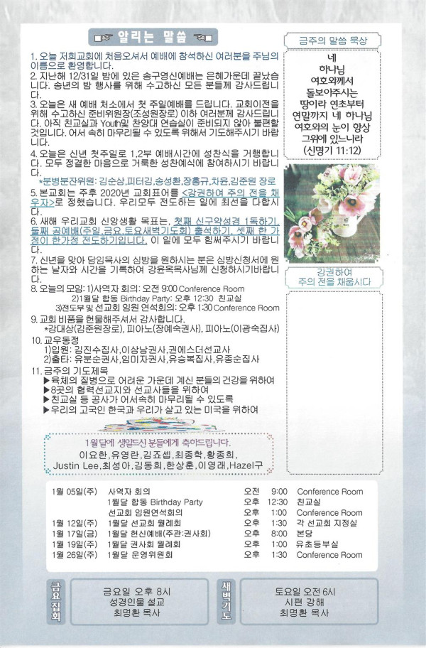 01/05/20 주일 교회 소식 페이지 정보 작성자 댓글 0건 조회 2,818회 작성일 20-01-04 10:03 목록 본문 이전글01/12/20 주일 교회 소식 20.01.11 다음글12/29/19 주일 교회 소식 19.12.28 댓글 0 댓글목록 등록된 댓글이 없습니다. 목록
