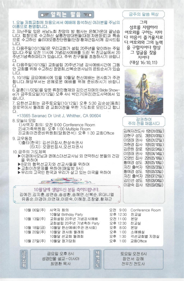 10/06/19 주일 교회 소식 페이지 정보 작성자 댓글 0건 조회 3,115회 작성일 19-10-05 14:23 목록 본문 이전글10/13/19 주일 교회 소식 19.10.12 다음글09/29/19 주일 교회 소식 19.09.28 댓글 0 댓글목록 등록된 댓글이 없습니다. 목록
