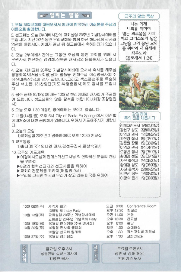 10/13/19 주일 교회 소식 페이지 정보 작성자 댓글 0건 조회 3,099회 작성일 19-10-12 14:41 목록 본문 이전글10/20/19 주일 교회 소식 19.10.19 다음글10/06/19 주일 교회 소식 19.10.05 댓글 0 댓글목록 등록된 댓글이 없습니다. 목록