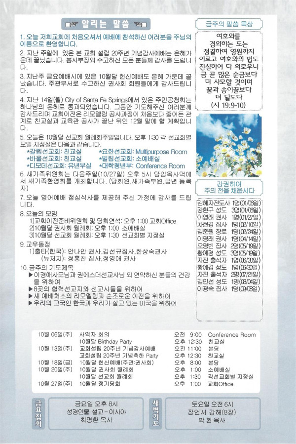 10/20/19 주일 교회 소식 페이지 정보 작성자 댓글 0건 조회 2,922회 작성일 19-10-19 13:09 목록 본문 이전글10/27/19 주일 교회 소식 19.10.26 다음글10/13/19 주일 교회 소식 19.10.12 댓글 0 댓글목록 등록된 댓글이 없습니다. 목록