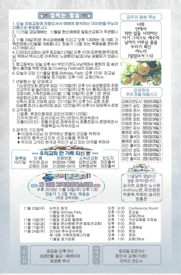 11/03/19 주일 교회 소식 페이지 정보 작성자 댓글 0건 조회 3,078회 작성일 19-11-02 12:46 목록 본문 이전글11/10/19 주일 교회 소식 19.11.09 다음글10/27/19 주일 교회 소식 19.10.26 댓글 0 댓글목록 등록된 댓글이 없습니다. 목록