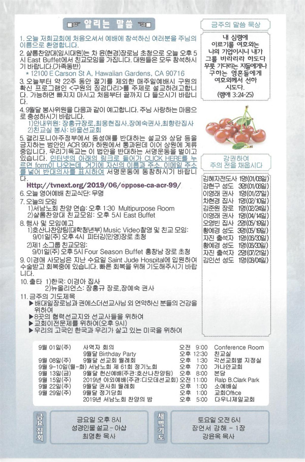 08/25/19 주일 교회 소식 페이지 정보 작성자 댓글 0건 조회 3,408회 작성일 19-08-24 11:07 목록 본문 이전글09/01/19 주일 교회 소식 19.08.31 다음글08/18/19 주일 교회 소식 19.08.17 댓글 0 댓글목록 등록된 댓글이 없습니다. 목록