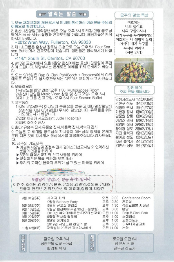 09/01/19 주일 교회 소식 페이지 정보 작성자 댓글 0건 조회 2,867회 작성일 19-08-31 17:00 목록 본문 이전글09/08-/19 주일 교회 소식 19.09.07 다음글08/25/19 주일 교회 소식 19.08.24 댓글 0 댓글목록 등록된 댓글이 없습니다. 목록