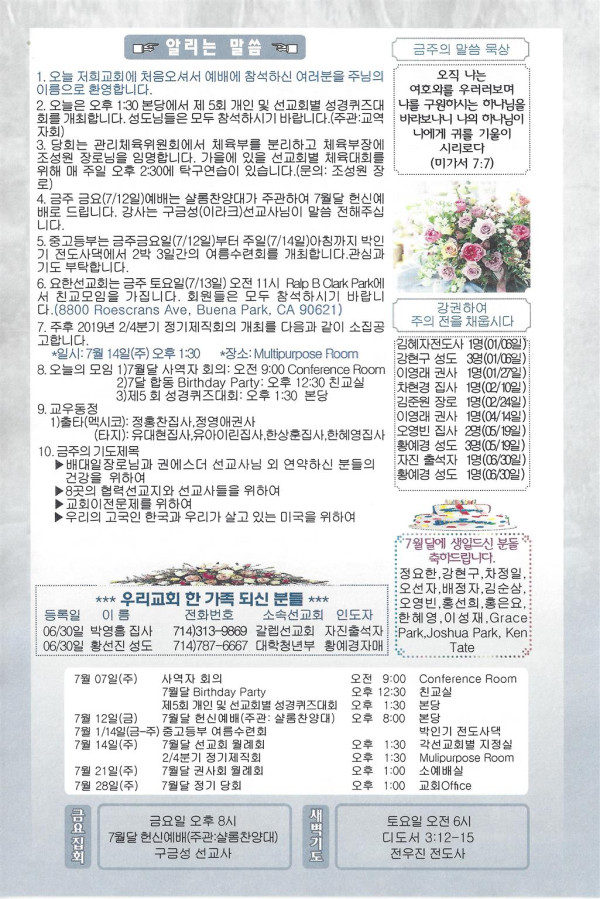 07/07/19 주일 교회 소식 페이지 정보 작성자 댓글 0건 조회 3,103회 작성일 19-07-06 11:01 목록 본문 이전글07/14/19 주일 교회 소식 19.07.13 다음글06/30/19 주일 교회 소식 19.06.29 댓글 0 댓글목록 등록된 댓글이 없습니다. 목록