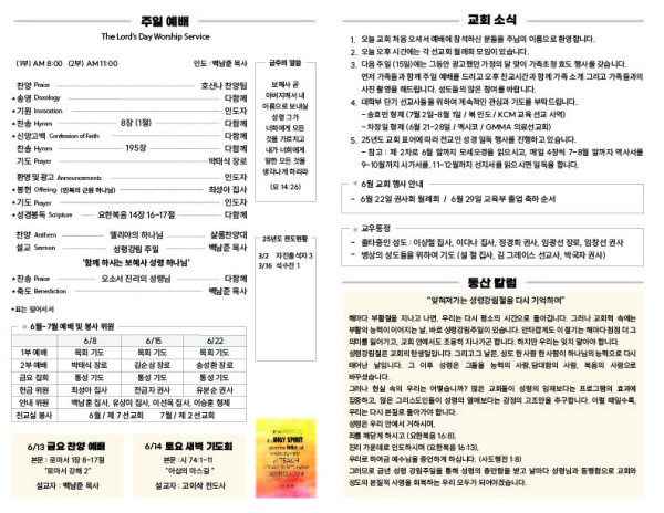 06/08/25 교회 주보 페이지 정보 작성자 아름다운동산교회 댓글 0건 조회 896회 작성일 25-06-07 07:26 목록 본문 06/08/25 이전글06/15/25 교회 주보 25.06.14 다음글06/01/25 교회 주보 25.05.31 댓글 0 댓글목록 등록된 댓글이 없습니다. 목록