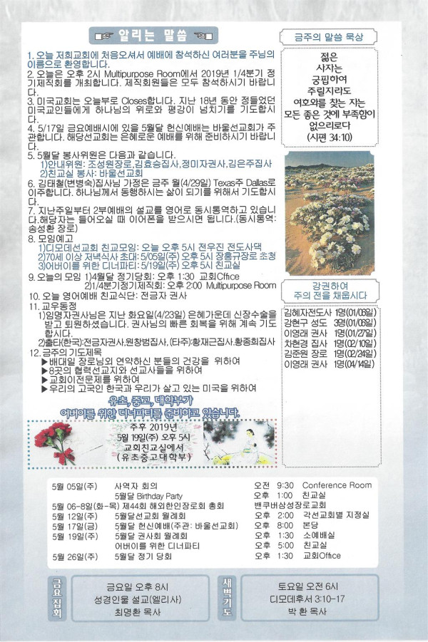 04/28/19 주일 교회 소식 페이지 정보 작성자 댓글 0건 조회 3,432회 작성일 19-04-27 11:38 목록 본문 이전글05/05/19 주일 교회소식 19.05.04 다음글04/21/19 주일 교회 소식 19.04.20 댓글 0 댓글목록 등록된 댓글이 없습니다. 목록