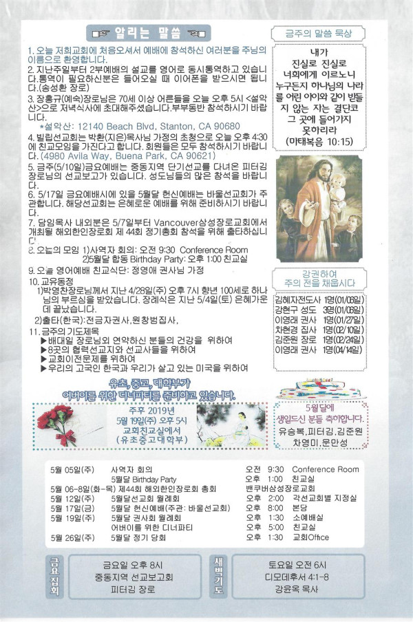 05/05/19 주일 교회소식 페이지 정보 작성자 댓글 0건 조회 3,230회 작성일 19-05-04 13:38 목록 본문 이전글05/12/19 주일 교회 소식 19.05.11 다음글04/28/19 주일 교회 소식 19.04.27 댓글 0 댓글목록 등록된 댓글이 없습니다. 목록