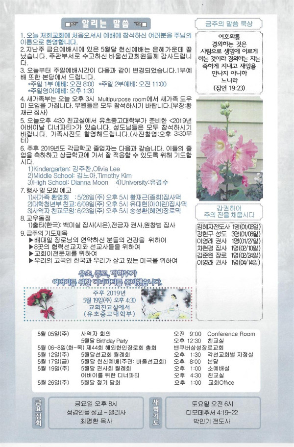 05/19/19 주일 교회 소식 페이지 정보 작성자 댓글 0건 조회 3,092회 작성일 19-05-18 08:45 목록 본문 이전글05/26-19 주일 교회 소식 19.05.25 다음글05/12/19 주일 교회 소식 19.05.11 댓글 0 댓글목록 등록된 댓글이 없습니다. 목록
