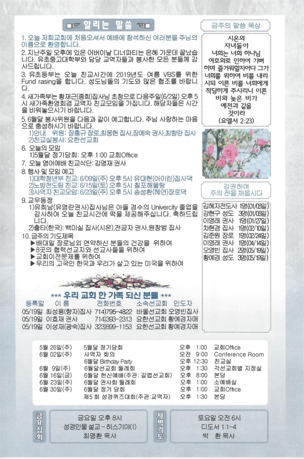 05/26-19 주일 교회 소식 페이지 정보 작성자 댓글 0건 조회 3,397회 작성일 19-05-25 11:00 목록 본문 이전글06/02/19 주일 교회 소식 19.06.01 다음글05/19/19 주일 교회 소식 19.05.18 댓글 0 댓글목록 등록된 댓글이 없습니다. 목록