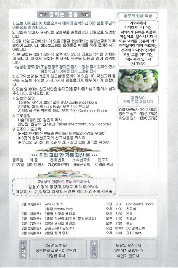 02/03/19 주일 교회 소식 페이지 정보 작성자 댓글 0건 조회 3,038회 작성일 19-02-02 09:23 목록 본문 이전글02/10/19 주일 교회소식 19.02.09 다음글01/27/19 주일 교회 소식 19.01.26 댓글 0 댓글목록 등록된 댓글이 없습니다. 목록