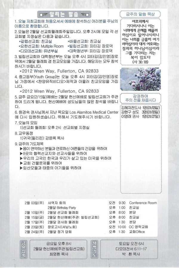 02/10/19 주일 교회소식 페이지 정보 작성자 댓글 0건 조회 2,863회 작성일 19-02-09 08:52 목록 본문 이전글02/17/19 주일 교회 소식 19.02.16 다음글02/03/19 주일 교회 소식 19.02.02 댓글 0 댓글목록 등록된 댓글이 없습니다. 목록