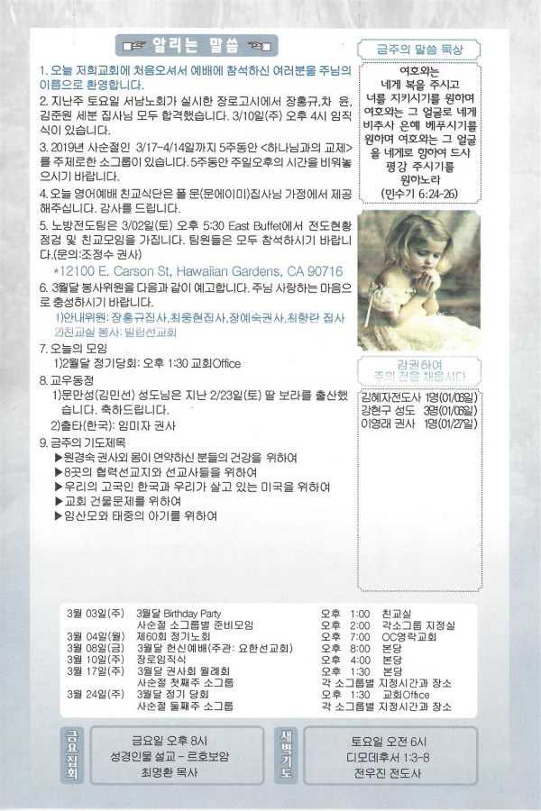 02/24/19 주일 교회 소식 페이지 정보 작성자 댓글 0건 조회 3,160회 작성일 19-02-23 16:33 목록 본문 이전글03/03/19 주일 교회 소식 19.03.02 다음글02/17/19 주일 교회 소식 19.02.16 댓글 0 댓글목록 등록된 댓글이 없습니다. 목록