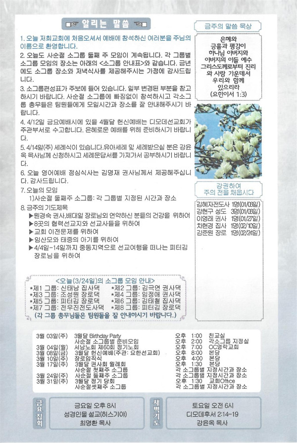 03/24/19 주일 교회 소식 페이지 정보 작성자 댓글 0건 조회 3,271회 작성일 19-03-23 10:40 목록 본문 이전글03/31/19 주일 교회 소식 19.03.30 다음글03/17/19 주일 교회 소식 19.03.16 댓글 0 댓글목록 등록된 댓글이 없습니다. 목록
