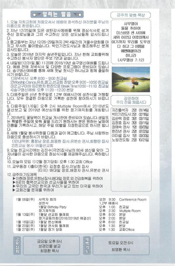 12/30/18 주일 교회 소식 페이지 정보 작성자 댓글 0건 조회 3,026회 작성일 18-12-29 13:52 목록 본문 이전글01/06/19 주일 교회 소식 19.01.05 다음글12/23/18 주일 교회 소식 18.12.22 댓글 0 댓글목록 등록된 댓글이 없습니다. 목록