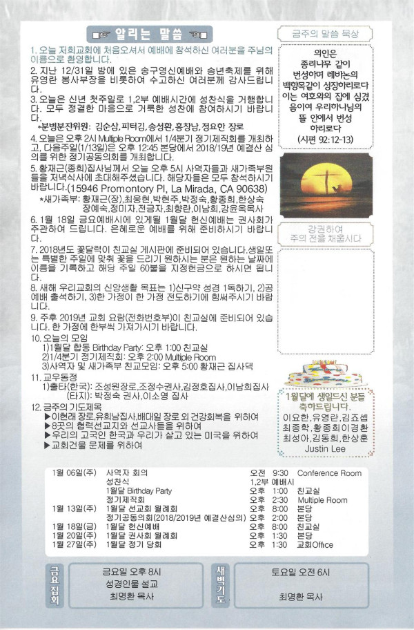 01/06/19 주일 교회 소식 페이지 정보 작성자 댓글 0건 조회 3,129회 작성일 19-01-05 13:02 목록 본문 이전글01/13/19 주일 교회 소식 19.01.12 다음글12/30/18 주일 교회 소식 18.12.29 댓글 0 댓글목록 등록된 댓글이 없습니다. 목록