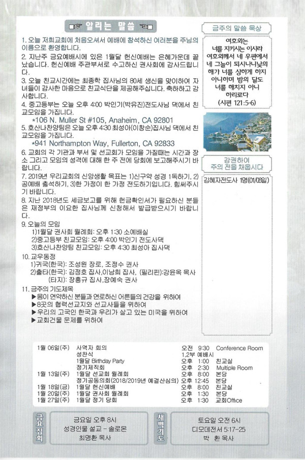01/20/19 주일 교회 소식 페이지 정보 작성자 댓글 0건 조회 2,866회 작성일 19-01-19 09:40 목록 본문 이전글01/27/19 주일 교회 소식 19.01.26 다음글01/13/19 주일 교회 소식 19.01.12 댓글 0 댓글목록 등록된 댓글이 없습니다. 목록