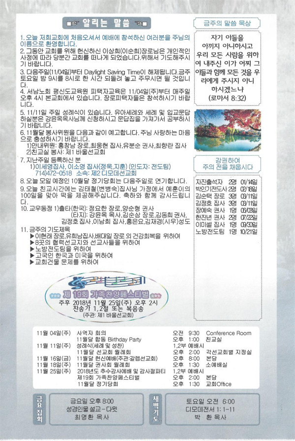 10/28/18 주일 교회 소식 페이지 정보 작성자 댓글 0건 조회 2,781회 작성일 18-10-27 10:20 목록 본문 이전글11/04/18 주일 교회 소식 18.11.03 다음글10/21/18 주일 교회소식 18.10.20 댓글 0 댓글목록 등록된 댓글이 없습니다. 목록