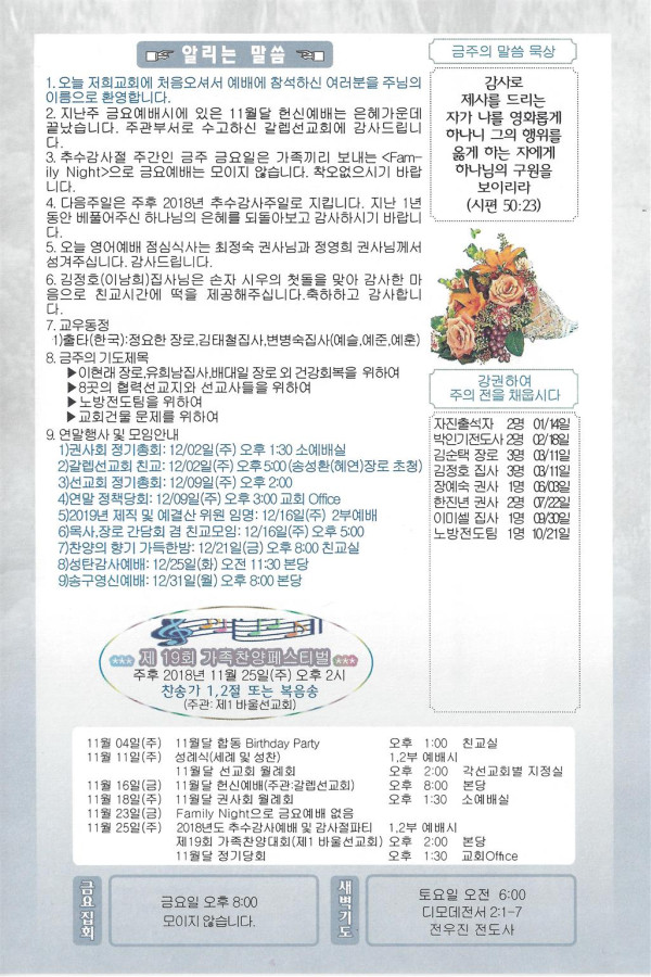 11/18/18 주일 교회 소식 페이지 정보 작성자 댓글 0건 조회 2,813회 작성일 18-11-17 10:38 목록 본문 이전글11/25/18 주일 교회 소식 18.11.24 다음글11/11/18 주일 교회 소식 18.11.10 댓글 0 댓글목록 등록된 댓글이 없습니다. 목록