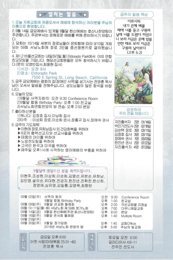 09/02/18 주일 교회 소식 페이지 정보 작성자 댓글 0건 조회 3,040회 작성일 18-09-01 10:55 목록 본문 이전글09/09/18 주일 교회 소식 18.09.08 다음글08/26/18 주일 교회 소식 18.08.25 댓글 0 댓글목록 등록된 댓글이 없습니다. 목록