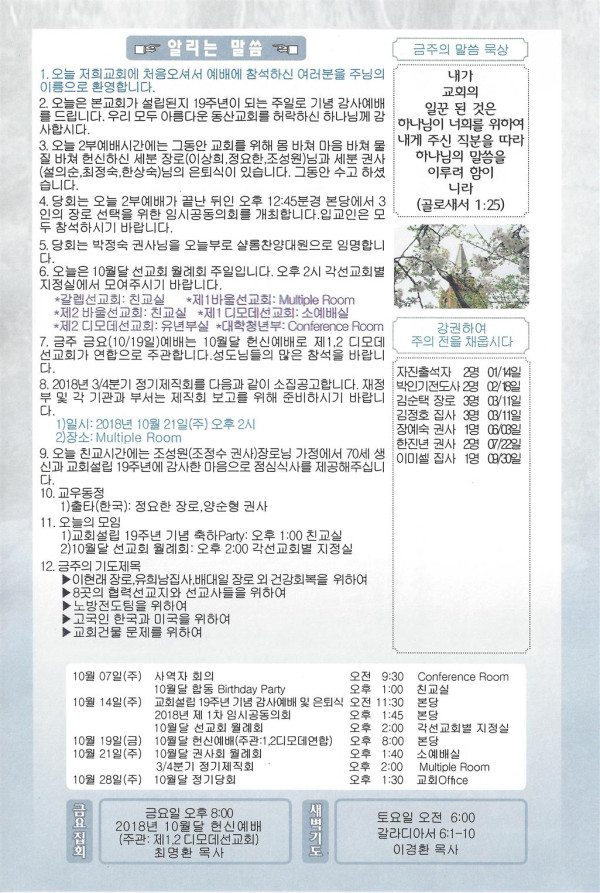 10/14/18 주일 교회 소식 페이지 정보 작성자 댓글 0건 조회 3,031회 작성일 18-10-13 09:22 목록 본문 이전글10/21/18 주일 교회소식 18.10.20 다음글10/07/18 주일 교회 소식 18.10.06 댓글 0 댓글목록 등록된 댓글이 없습니다. 목록