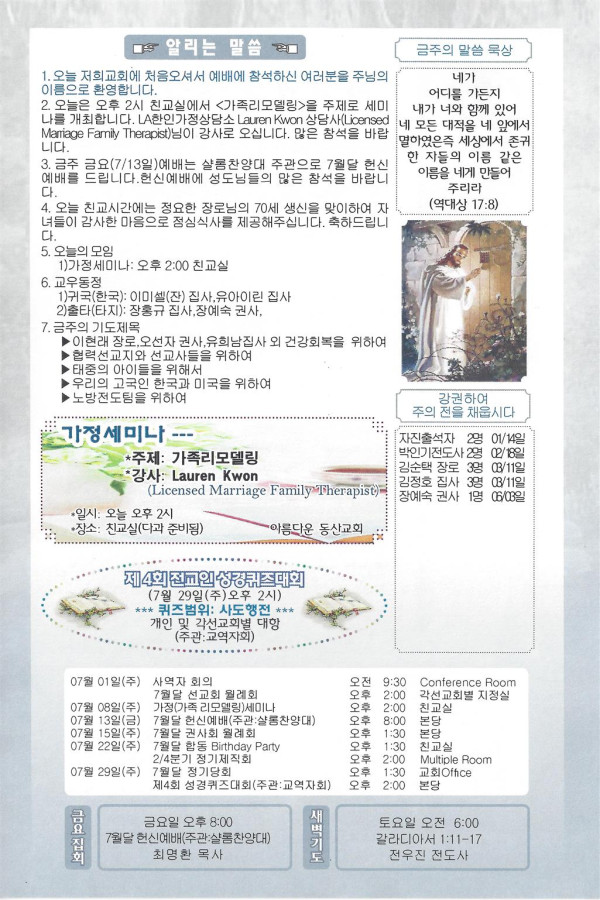 07/08/18 주일 교회 소식 페이지 정보 작성자 댓글 0건 조회 2,982회 작성일 18-07-07 09:03 목록 본문 이전글07/15/18 주일 교회 소식 18.07.14 다음글07/01/18 주일 교회 소식 18.06.30 댓글 0 댓글목록 등록된 댓글이 없습니다. 목록