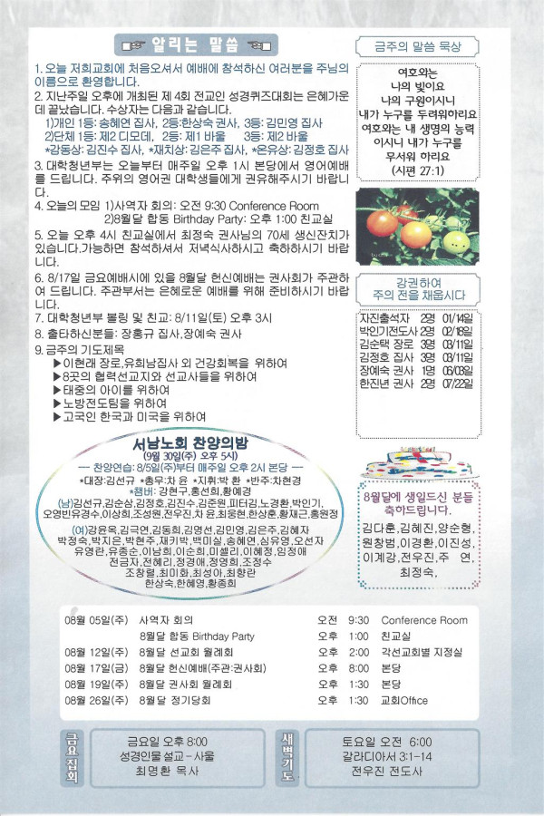 08/05/18 주일 교회 소식 페이지 정보 작성자 댓글 0건 조회 2,990회 작성일 18-08-04 11:17 목록 본문 이전글08/12/18 주일 교회 소식 18.08.11 다음글07/29/18 주일 교회 소식 18.07.28 댓글 0 댓글목록 등록된 댓글이 없습니다. 목록
