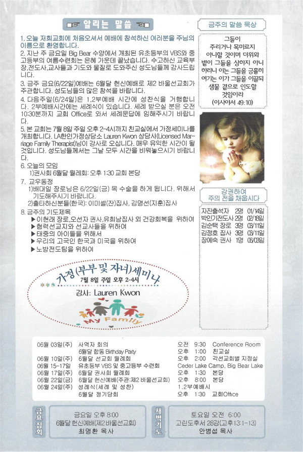 06/17/18 주일 교회 소식 페이지 정보 작성자 댓글 0건 조회 3,172회 작성일 18-06-16 12:11 목록 본문 이전글06/24/18 주일 교회 소식 18.06.23 다음글06/10/18 주일 교회 소식 18.06.09 댓글 0 댓글목록 등록된 댓글이 없습니다. 목록