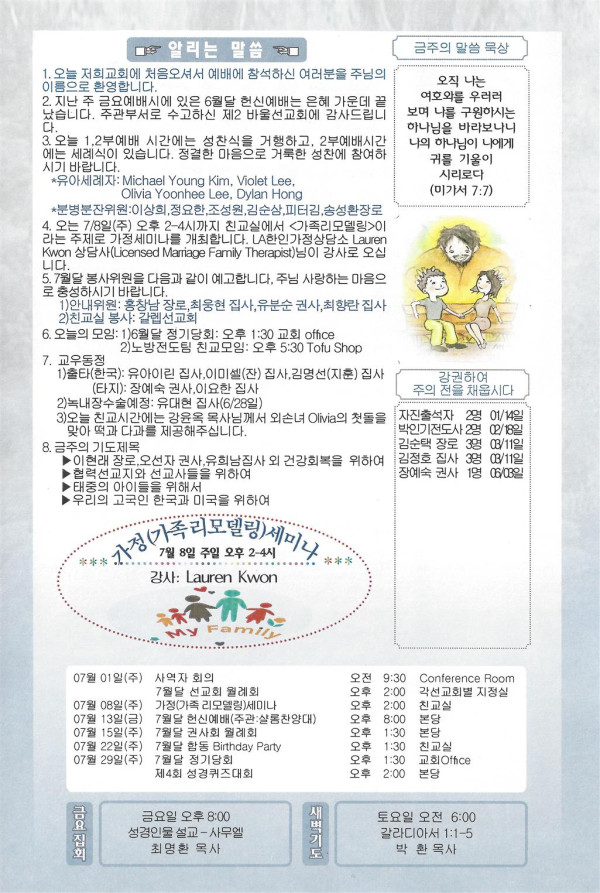 06/24/18 주일 교회 소식 페이지 정보 작성자 댓글 0건 조회 3,092회 작성일 18-06-23 11:46 목록 본문 이전글07/01/18 주일 교회 소식 18.06.30 다음글06/17/18 주일 교회 소식 18.06.16 댓글 0 댓글목록 등록된 댓글이 없습니다. 목록