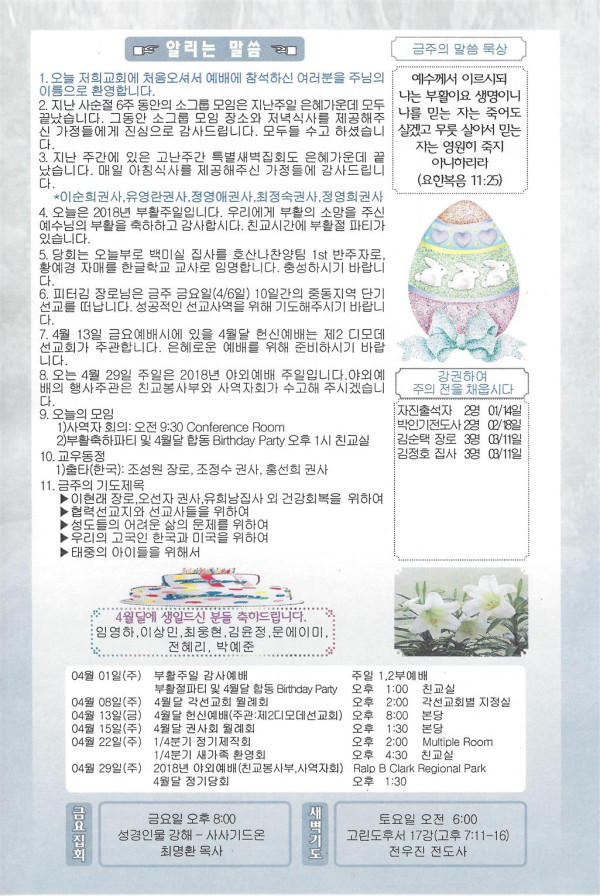 04/01/18 주일 교회 소식 페이지 정보 작성자 댓글 0건 조회 2,826회 작성일 18-03-31 11:10 목록 본문 이전글04/08/18 주일 교회 소식 18.04.07 다음글03/25/18 주일 교회 소식 18.03.24 댓글 0 댓글목록 등록된 댓글이 없습니다. 목록