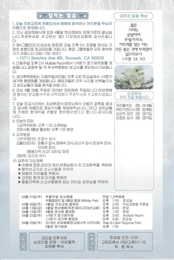 04/15/18 주일 교회 소식 페이지 정보 작성자 댓글 0건 조회 3,123회 작성일 18-04-14 09:54 목록 본문 이전글04/22/18 주일 교회 소식 18.04.21 다음글04/08/18 주일 교회 소식 18.04.07 댓글 0 댓글목록 등록된 댓글이 없습니다. 목록