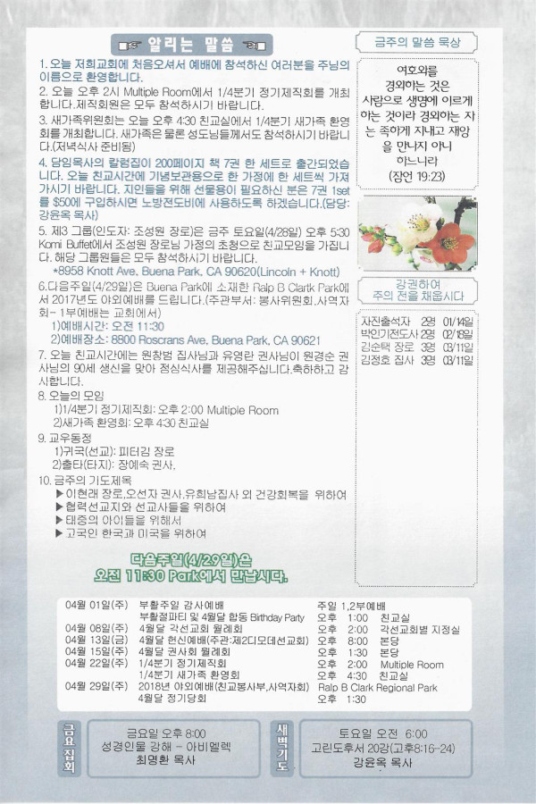 04/22/18 주일 교회 소식 페이지 정보 작성자 댓글 0건 조회 2,861회 작성일 18-04-21 10:44 목록 본문 이전글04/29/18 주일 교회 소식 18.04.28 다음글04/15/18 주일 교회 소식 18.04.14 댓글 0 댓글목록 등록된 댓글이 없습니다. 목록
