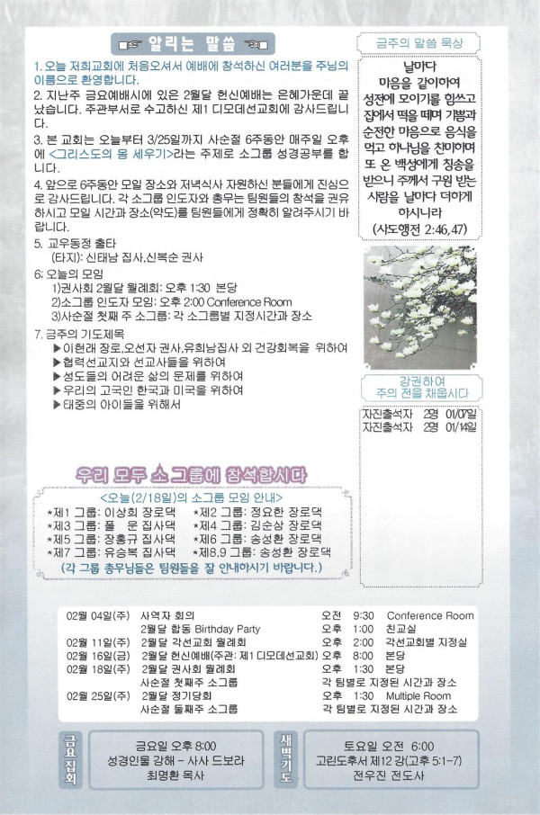 02/18/18 주일 교회 소식 페이지 정보 작성자 댓글 0건 조회 2,623회 작성일 18-02-17 15:24 목록 본문 이전글02/25/18 주일 교회소식 18.02.24 다음글02/11/18 주일 교회 소식 18.02.10 댓글 0 댓글목록 등록된 댓글이 없습니다. 목록