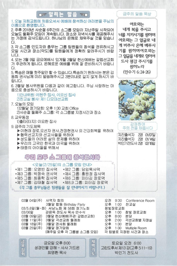 02/25/18 주일 교회소식 페이지 정보 작성자 댓글 0건 조회 2,924회 작성일 18-02-24 10:31 목록 본문 이전글03/04/18 주일 교회 소식 18.03.03 다음글02/18/18 주일 교회 소식 18.02.17 댓글 0 댓글목록 등록된 댓글이 없습니다. 목록