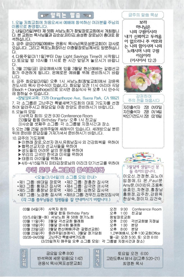 03/04/18 주일 교회 소식 페이지 정보 작성자 댓글 0건 조회 3,059회 작성일 18-03-03 13:00 목록 본문 이전글03/11/18 주일 교회 소식 18.03.10 다음글02/25/18 주일 교회소식 18.02.24 댓글 0 댓글목록 등록된 댓글이 없습니다. 목록