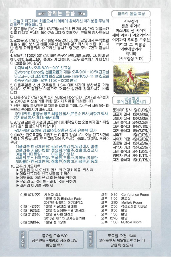 12/31/17 주일 교회 소식 페이지 정보 작성자 댓글 0건 조회 2,787회 작성일 17-12-30 16:13 목록 본문 이전글01/07/18 주일 교회 소식 18.01.06 다음글12/24/17 주일 교회 소식 17.12.23 댓글 0 댓글목록 등록된 댓글이 없습니다. 목록