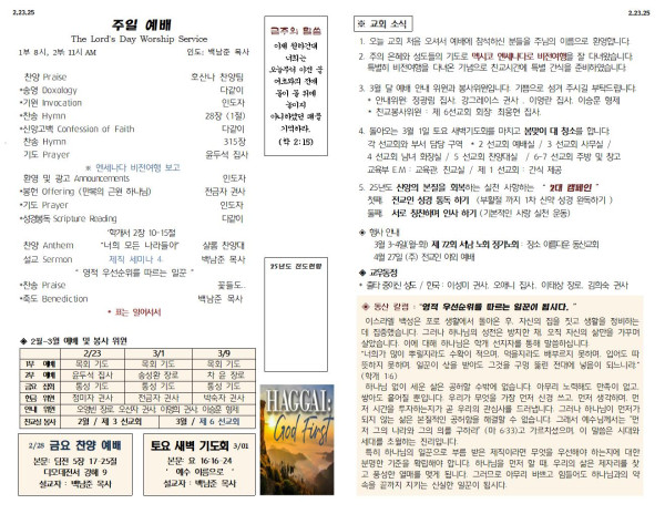 02/23/25 교회 주보 페이지 정보 작성자 아름다운동산교회 댓글 0건 조회 1,302회 작성일 25-02-22 07:59 목록 본문 02/23/25 이전글03/02/25 교회 주보 25.03.01 다음글02/16/25 교회 주보 25.02.15 댓글 0 댓글목록 등록된 댓글이 없습니다. 목록