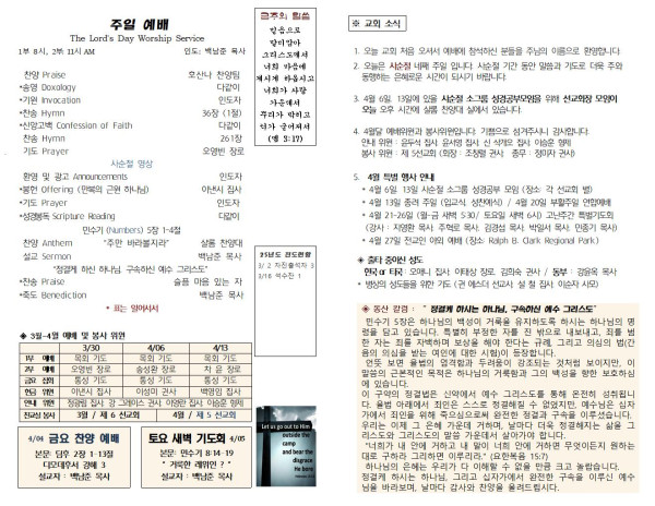 03/30/25 교회 주보 페이지 정보 작성자 아름다운동산교회 댓글 0건 조회 1,157회 작성일 25-03-29 09:57 목록 본문 03/30/25 이전글04/06/25 교회 주보 25.04.05 다음글03/16/25 교회 주보 25.03.15 댓글 0 댓글목록 등록된 댓글이 없습니다. 목록
