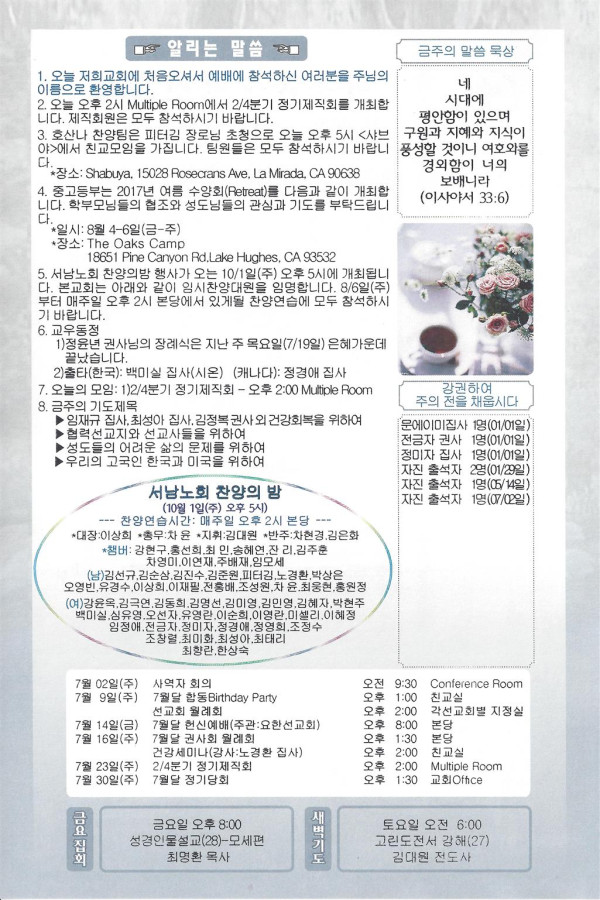 07/23/17 주일 교회 소식 페이지 정보 작성자 댓글 0건 조회 2,799회 작성일 17-07-22 09:46 목록 본문 이전글07/30/17 주일 교회 소식 17.07.29 다음글07/16/17 주일 교회 소식 17.07.15 댓글 0 댓글목록 등록된 댓글이 없습니다. 목록