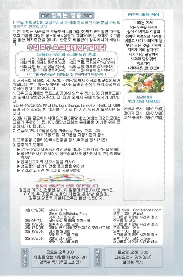 03/05/17 주일 교회 소식 페이지 정보 작성자 댓글 0건 조회 3,075회 작성일 17-03-04 12:43 목록 본문 이전글03/12/17 주일 교회 소식 17.03.11 다음글02/26/17 주일 교회 소식 17.02.25 댓글 0 댓글목록 등록된 댓글이 없습니다. 목록