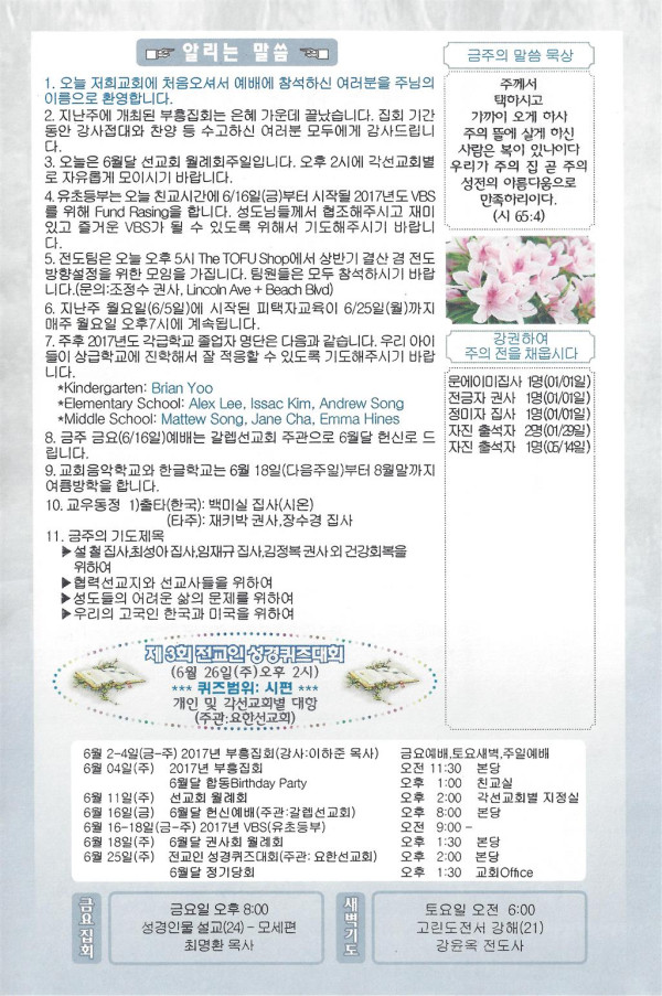06/11/17 주일 교회 소식 페이지 정보 작성자 댓글 0건 조회 2,939회 작성일 17-06-10 11:36 목록 본문 이전글06/18/17 주일 교회 소식 17.06.17 다음글06-04-17 주일 교회 소식 17.06.03 댓글 0 댓글목록 등록된 댓글이 없습니다. 목록