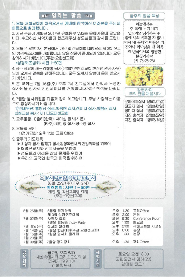 06/25/17 주일 교회 소식 페이지 정보 작성자 댓글 0건 조회 3,247회 작성일 17-06-24 15:47 목록 본문 이전글07/02/17 주일 교회 소식 17.07.01 다음글06/18/17 주일 교회 소식 17.06.17 댓글 0 댓글목록 등록된 댓글이 없습니다. 목록
