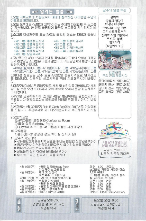 04/02/17 주일 교회 소식 페이지 정보 작성자 댓글 0건 조회 2,905회 작성일 17-04-01 00:00 목록 본문 이전글04/09/17 주일 교회 소식 17.04.08 다음글03/26/17 주일 교회 소식 17.03.25 댓글 0 댓글목록 등록된 댓글이 없습니다. 목록