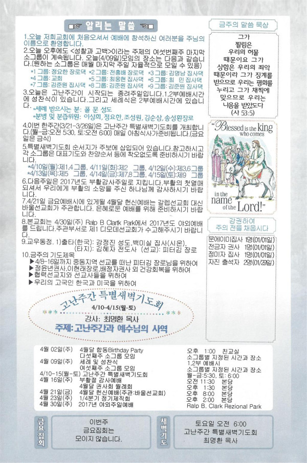 04/09/17 주일 교회 소식 페이지 정보 작성자 댓글 0건 조회 3,258회 작성일 17-04-08 12:49 목록 본문 이전글04/16/17 부활감사주일 교회 소식 17.04.15 다음글04/02/17 주일 교회 소식 17.04.01 댓글 0 댓글목록 등록된 댓글이 없습니다. 목록