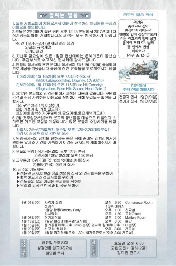 01/15/17 주일 교회 소식 페이지 정보 작성자 댓글 0건 조회 2,916회 작성일 17-01-14 11:44 목록 본문 이전글02/05/17 주일 교회 소식 17.02.04 다음글01/08/17 주일 교회 소식 17.01.07 댓글 0 댓글목록 등록된 댓글이 없습니다. 목록