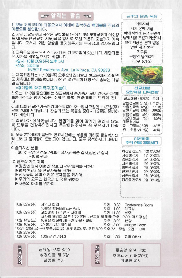 10/23/16 주일 교회 소식 페이지 정보 작성자 댓글 0건 조회 2,664회 작성일 16-10-22 15:38 목록 본문 이전글10/30/16 주일 교회 소식 16.10.29 다음글10/16/16 주일 교회 소식 16.10.15 댓글 0 댓글목록 등록된 댓글이 없습니다. 목록