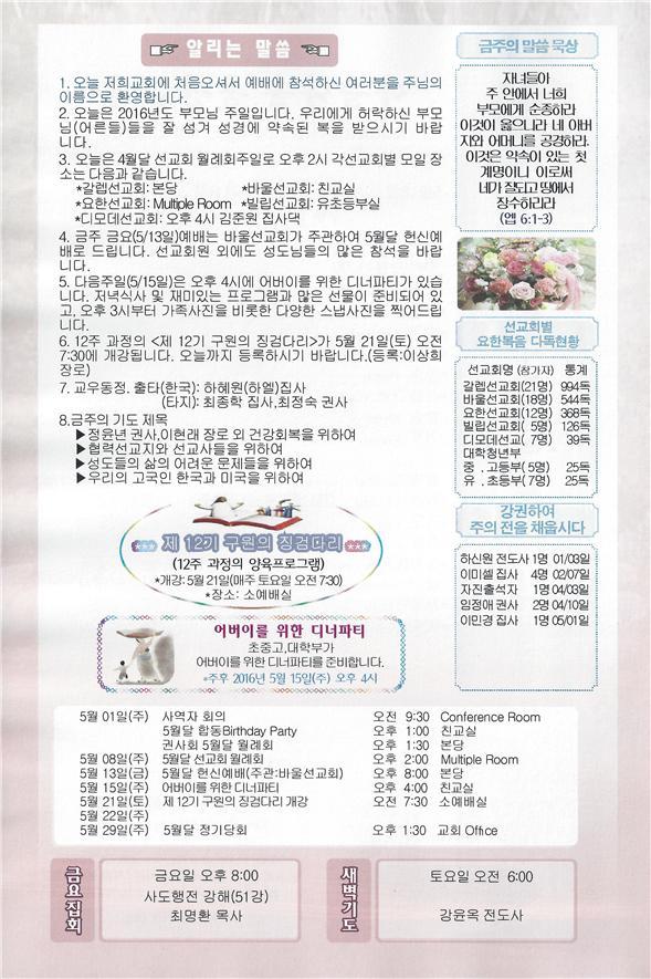 다음주일(5/15일)은 오후 4시에 어버이를 위한 디너파티가 있습니다. 저녁식사 및 재미있는 프로그램과 많은 선물이 준비되어 있고, 오후 3시부터 가족사진을 비롯한 다양한 스냅사진을 찍어드립니다.